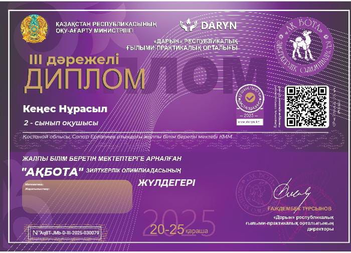 Кеңес Нұрасыл, 2 сынып оқушысы, «Ақбота» зияткерлік олимпиадасы, 3 орын