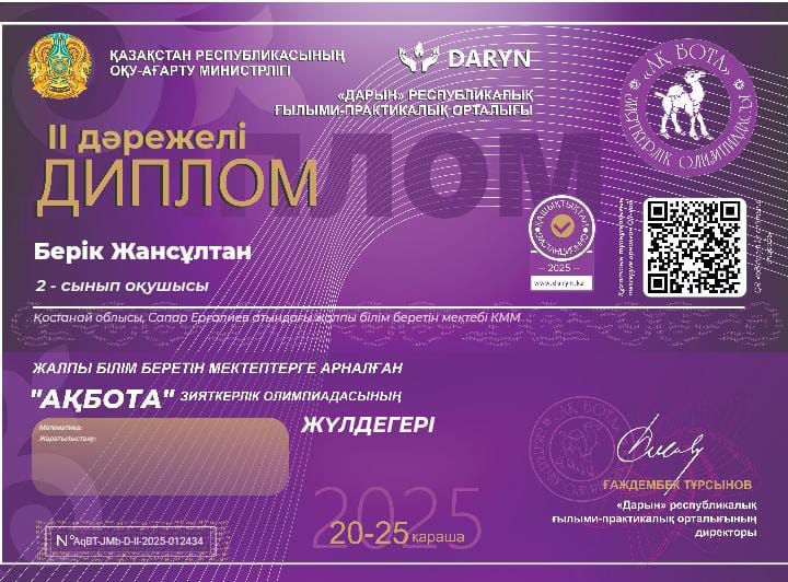 Берік Жансұлтан, 2 сынып оқушысы, «Ақбота» зияткерлік олимпиадасы, 2 орын
