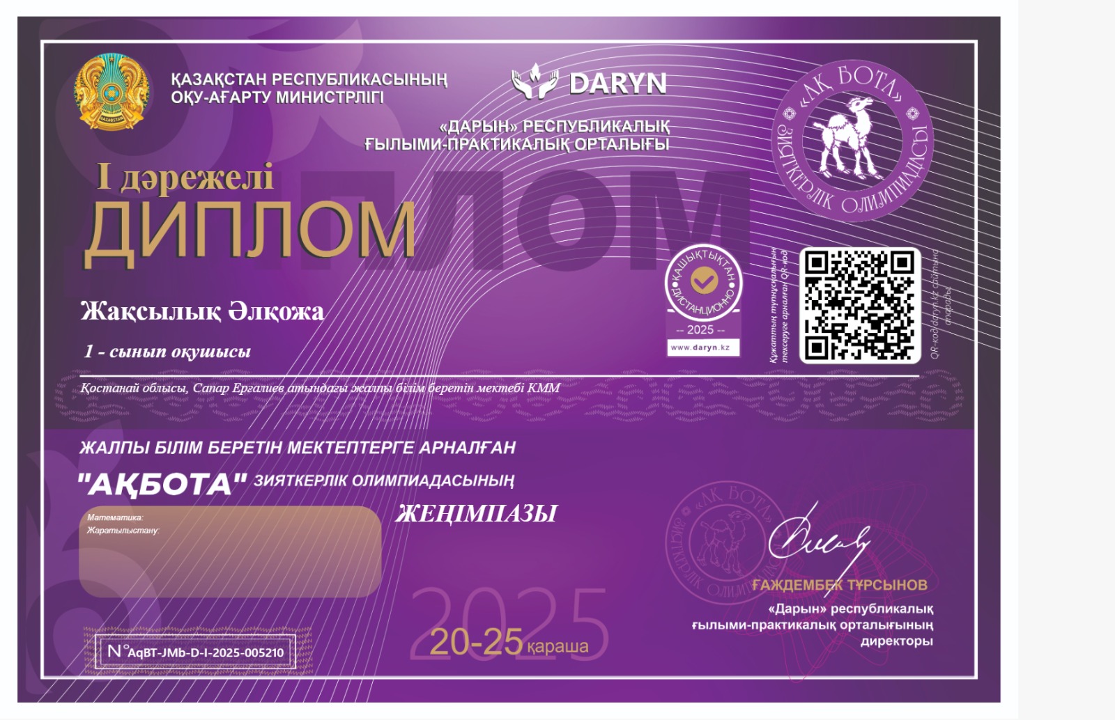 Жақсылық Әлқожа, 1 сынып оқушысы, «Ақбота» зияткерлік олимпиадасы, 1 орын