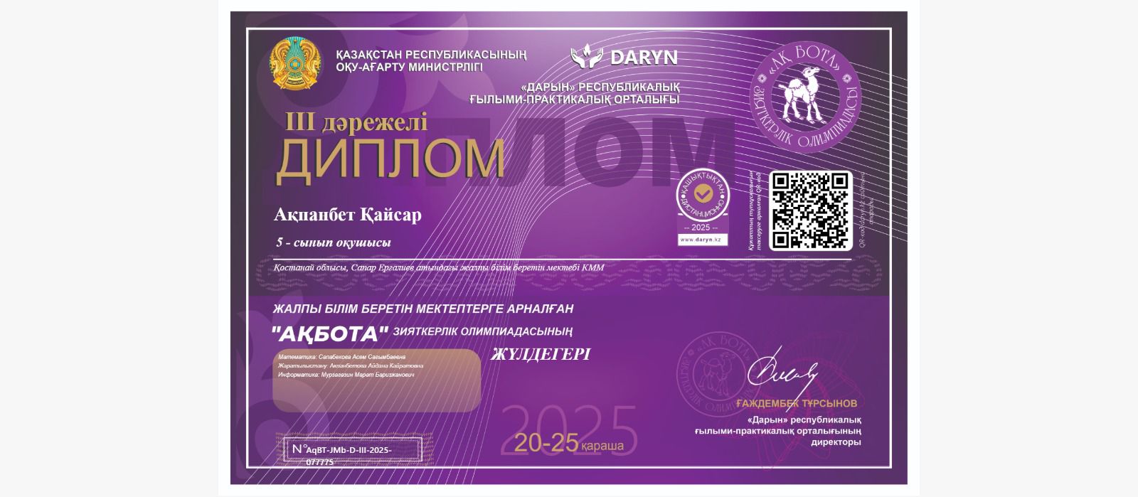 Ақпанбет Қайсар, 5 сынып оқушысы, «Ақбота» зияткерлік олимпиадасы, 3 орын