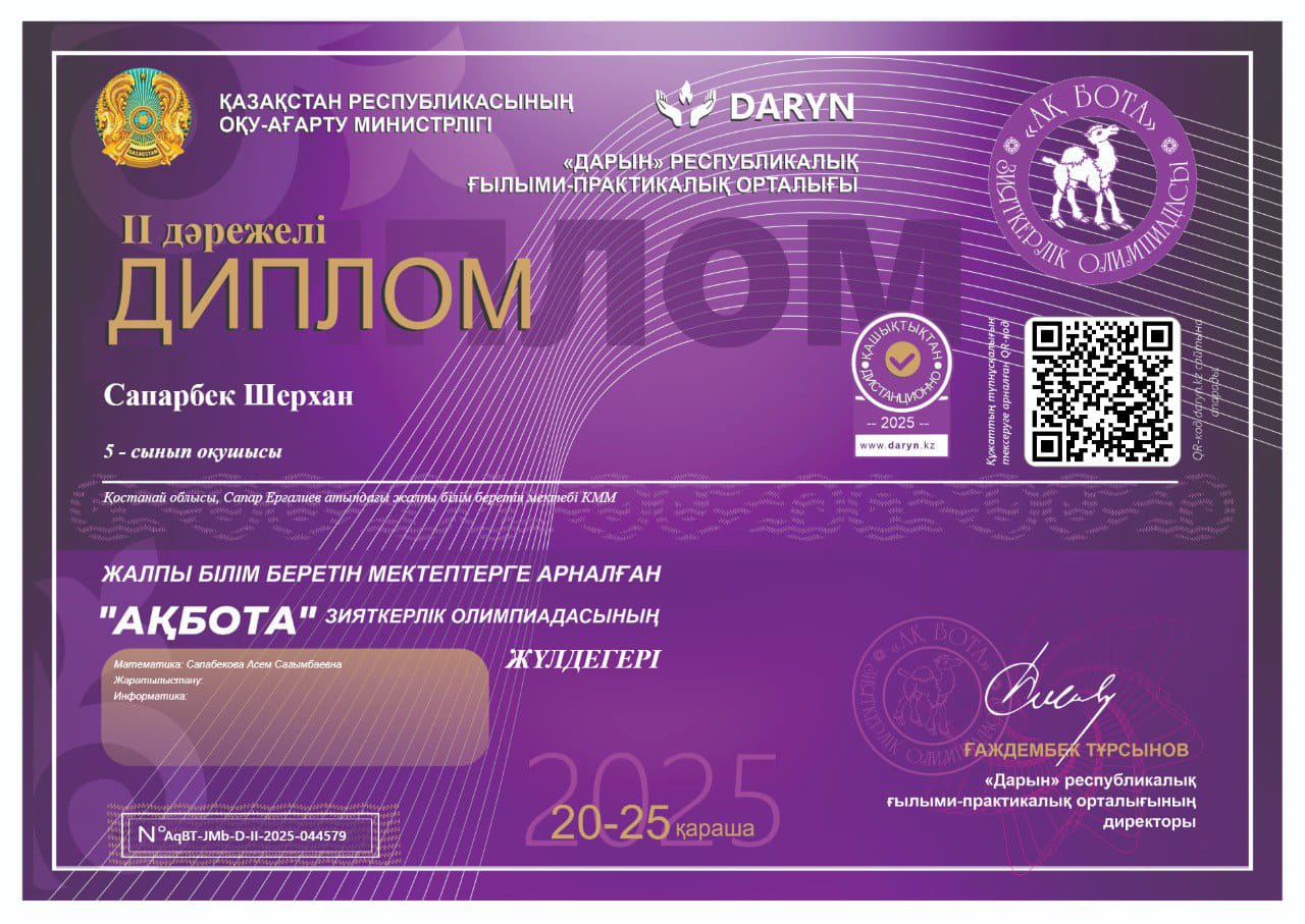Сапарбек Шерхан, 5 сынып оқушысы, «Ақбота» зияткерлік олимпиадасы, 2 орын