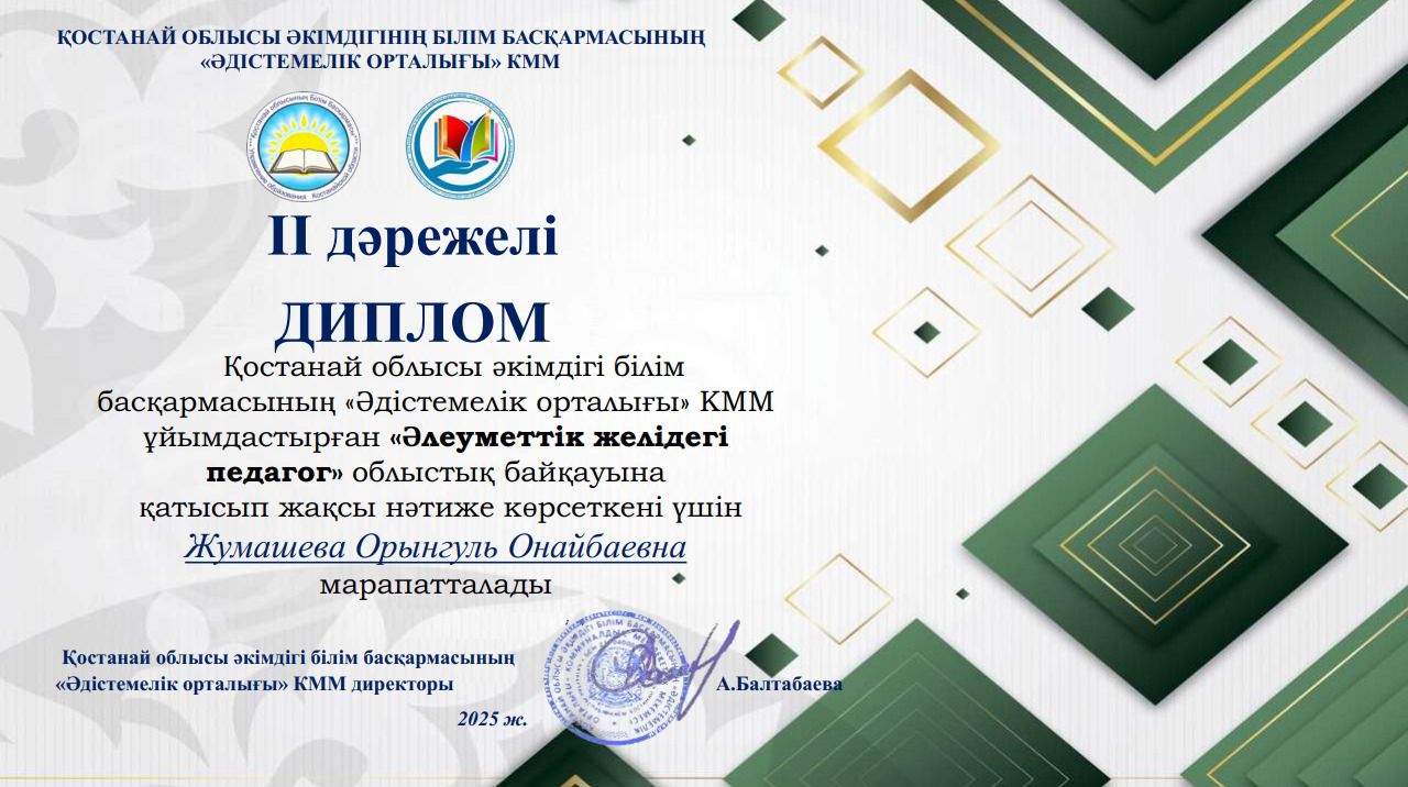 Жумашева О.О., Облыстық әлеуметтік желідегі педагог сайысы 2орын