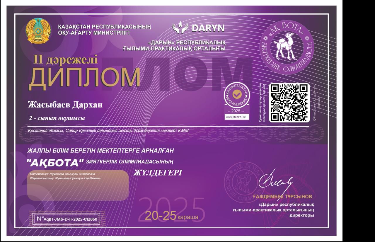 Жасыбаев Дархан, 2 сынып оқушысы, «Ақбота» зияткерлік олимпиадасы, 2 орын