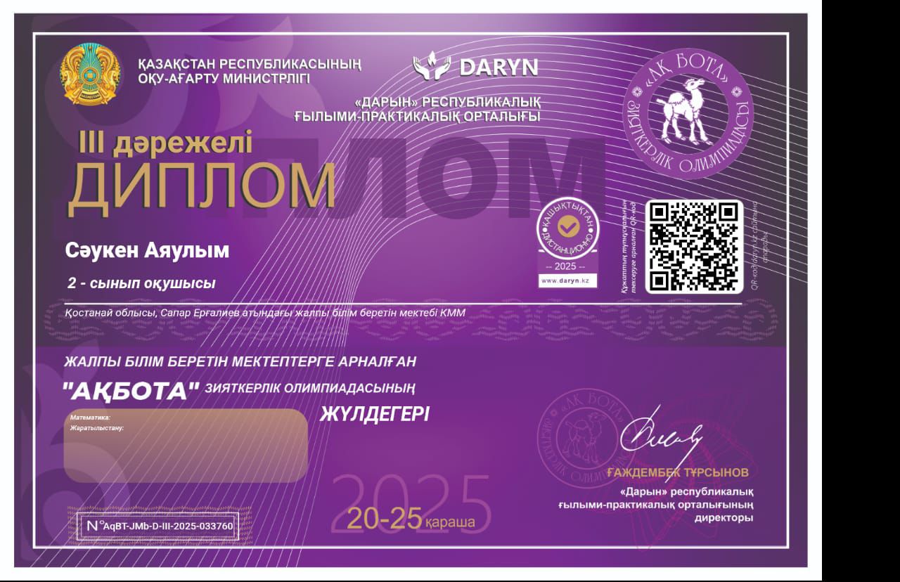 Сәукен Аяулым, 2 сынып оқушысы, «Ақбота» зияткерлік олимпиадасы, 3 орын