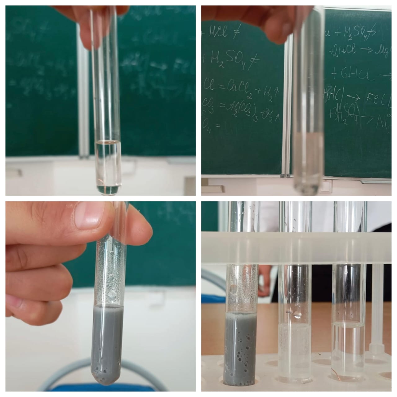 Тәжірибе барысында алюминий, мырыш түйіршіктері мен мыс сымының тұз қышқылы ерітіндісімен әрекеттесуін зерттеп, білім алушылар қорытынды шығара алды.