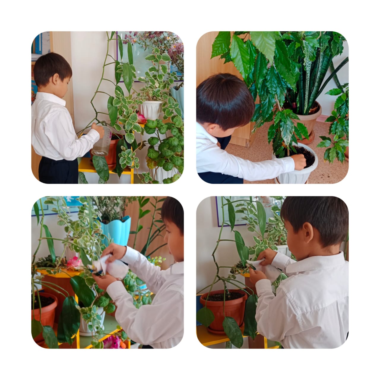 "Адал азамат" Біртұтас тәрбие бағдарламасы аясында, "Өнегелі 15 минут" шеңберінде 1-сынып білім алушысы - Сарсимбай Шерхан сынып гүлдерін суарып, топырағын қопсытып, жапырақтарын ылғал шүберекпен сүртіп күтім жасады.