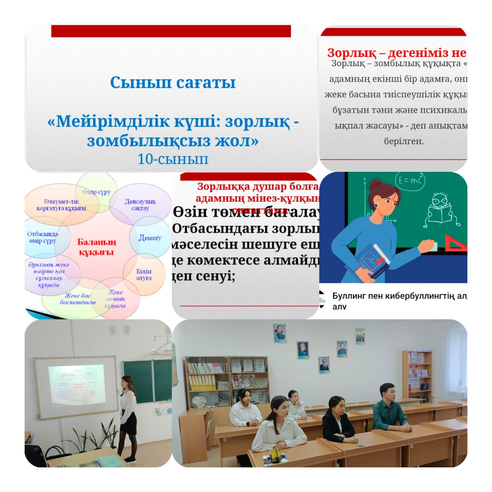 «Адал азамат: Біртұтас тәрбие» бағдарламасын іске асыру мақсатында 10 -сыныпта "Мейірімділік күші - зорлық-зомбылықсыз жол"тақырыбында сынып сағаты өткізілді.