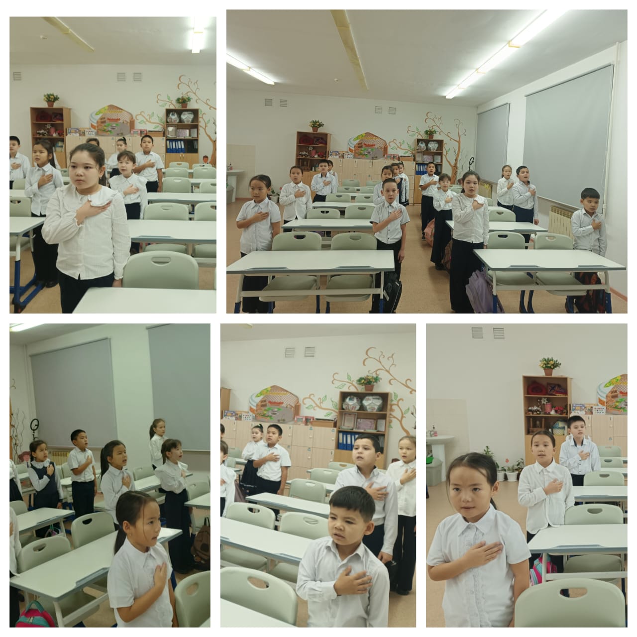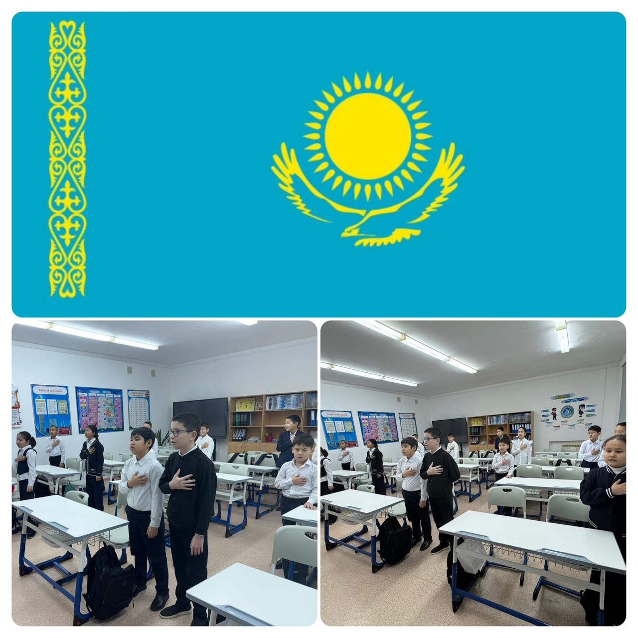 «Адал азамат:Біртұтас тәрбие» бағдарламасы аясында 3-сынып білім алушылары әр дүйсенбі күні Мемлекеттік гимнді орындайды.
