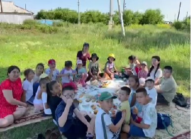 🔰Мақсаты: Балалардың жазғы демалысын тиімді, қызықты өткізуге мүмкіндік жасау. "Балапан" денсаулықты лагерінде балаларды қабылдап алып, лагерьдің ережелерін қайталап естеріне түсірдік. Таңертеңгі сергіту жаттығулары жасалды. Содан таза ауаға саяхатқа шығып, тамақтанып, ән айтып, би билеп, түрлі ойындарды ойнады.