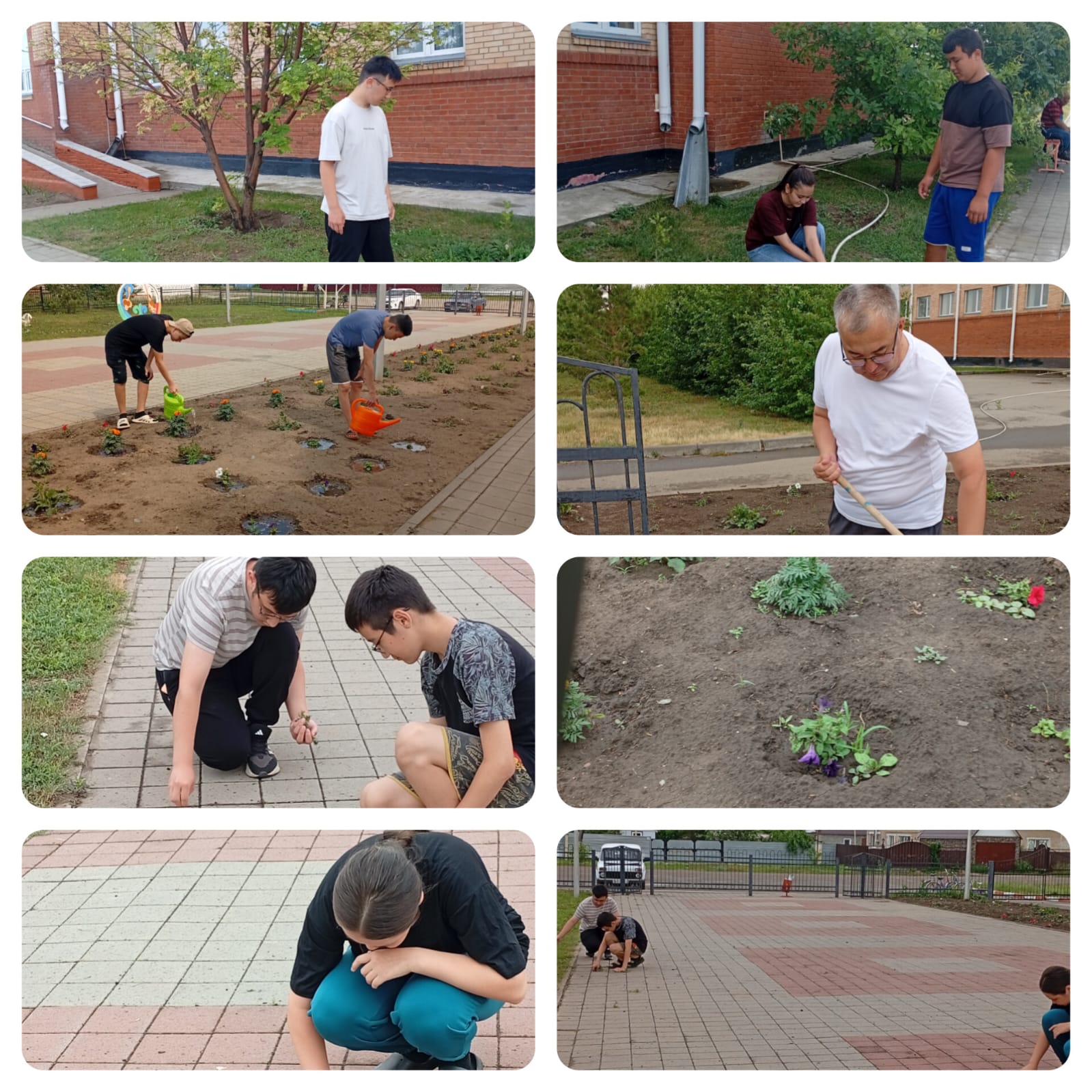 Көгалдандыру жұмыстары. Мақсаты: Мектеп ауласындағы гүлдерді күту. Ауланың көркеюіне ат салысу.