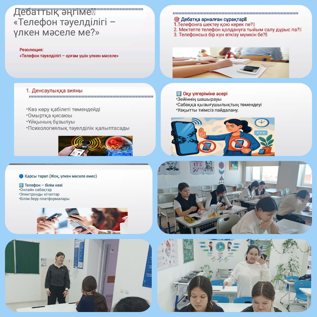 "Адал Азамат: біртұтас тәрбие бағдарламасы аясында "Жастар" дебат клубының кезекті отырысында "Телефон тәуелділігі - үлкен мәселе ме?" тақырыбында дебатшылар арасында әңгіме өткізілді. Мақсаты: Телефонның зияны мен пайдасы туралы пікірлесу; Тәуелділік туралы ойларын тыңдау, өз ойларын еркін жеткізуге дағдыландыру; Бір- бірінің пікірін сыйлауға тәрбиелеу. Жетекші: А.Сапабекова #Адал_азамат #Дебат #Жастар_клубы