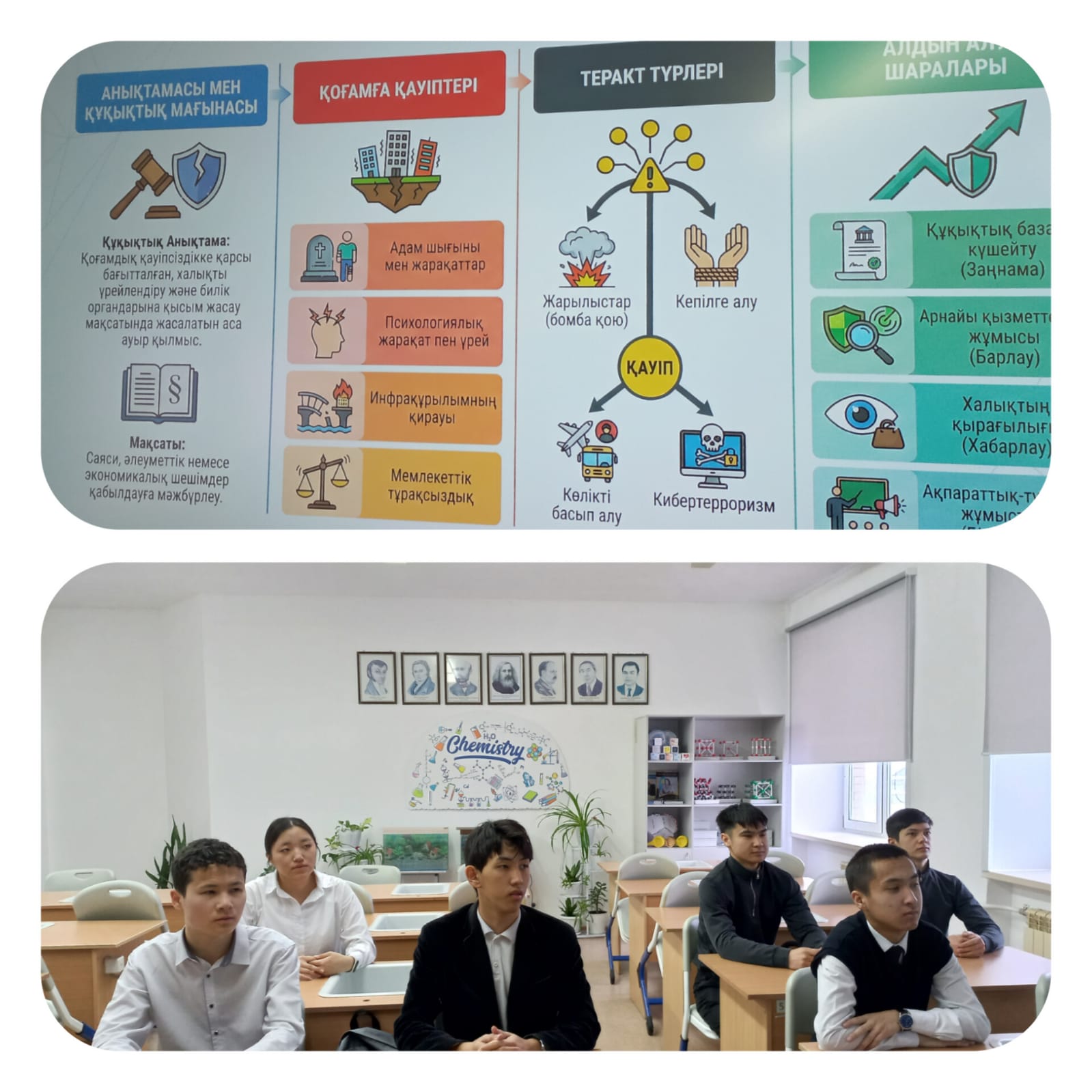 Мақсаты: Білім алушыларға терроризмнің қоғамға қауіпті құбылыс екенін түсіндіру, қауіпсіздік мәдениетін қалыптастыру және бейбітшілік құндылықтарын насихаттау.
